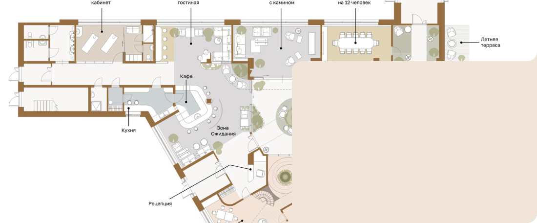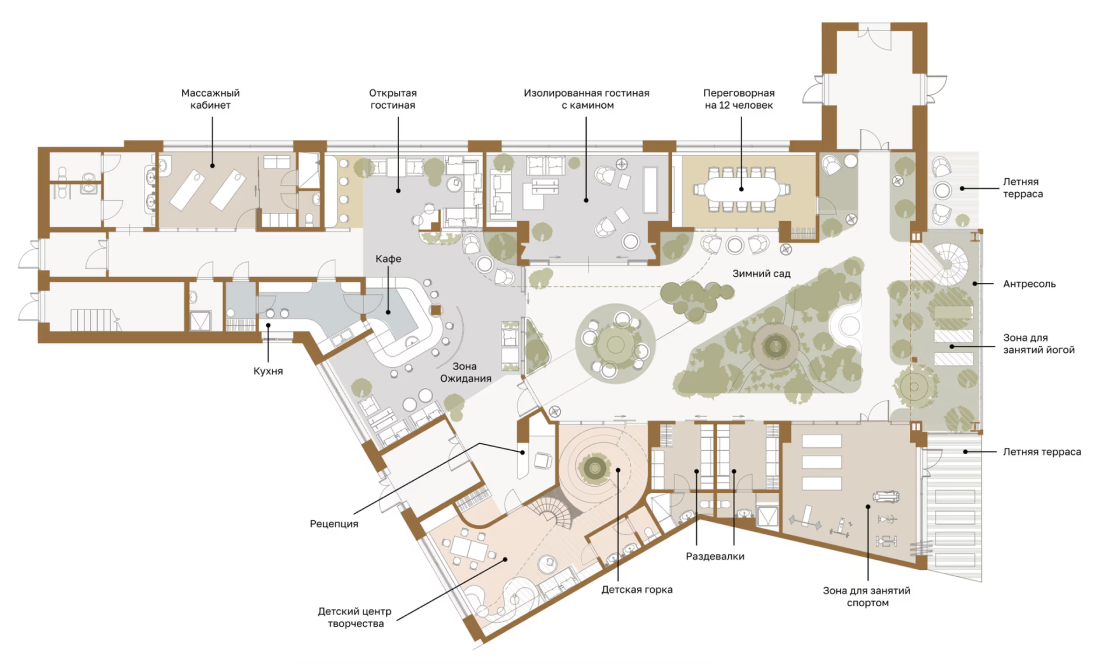 Здесь можно организовать встречу в коворкинге и обсудить бизнес-стратегию в переговорной, посетить массажный кабинет, заняться фитнесом в зоне для спорта, насладиться завтраком в кофейне, провести семейное торжество в гостиной с камином или устроить праздник для ребёнка в детском центре творчества.