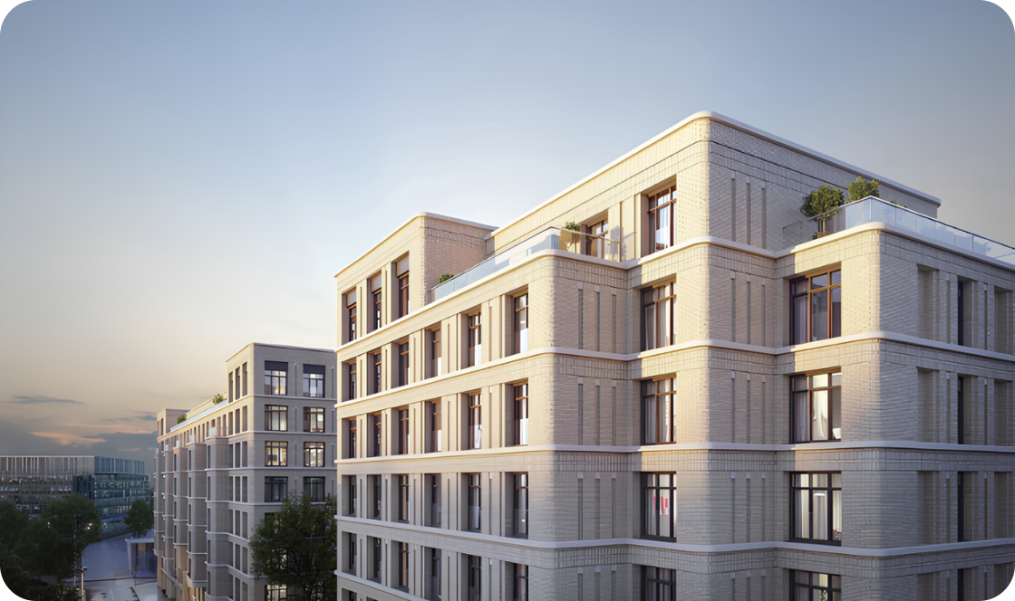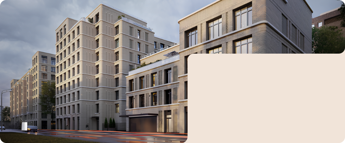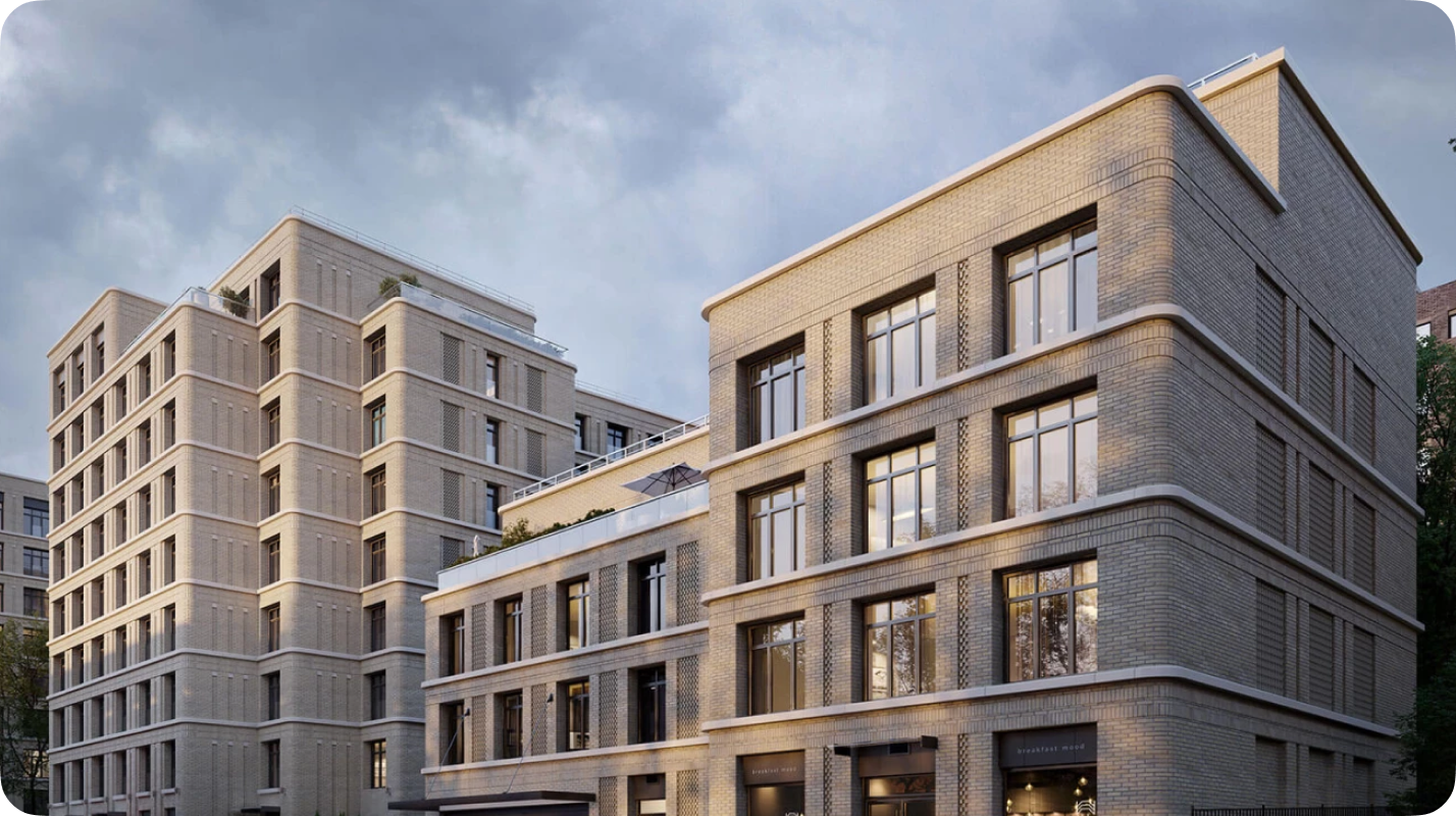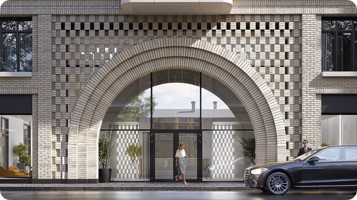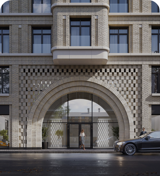 Стильные фасады из клинкерного кирпича с выступами террас. Большие окна и полное остекление пространства. Архитектурное освещение подчеркивает особенный характер жилого комплекса.