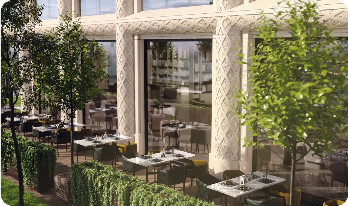 Фитнес и спа, кинозал и зал для семейных торжеств, коворкинг и детский клуб, лаундж с библиотекой и терраса площадью 120 м² для резидентов