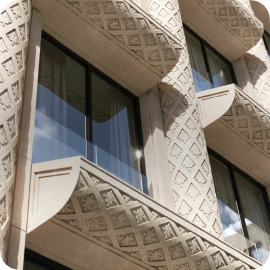 Доминирующей идеей архитектурного облика жилого комплекса получила живописная мраморная фактура и визуальный образ происхождения самого материала в естественной среде.